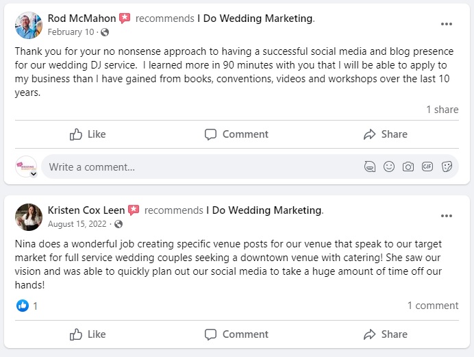 The steps, prompts and procedures outlined in this course will teach wedding professionals how to create content that is effective, high-quality and can be produced quickly. When implementing this strategy of quality content over a consistent time period you will experience benefits such as increased followers, more engagement, and most importantly targeted leads directly to your Direct Messages or to your website within the first 6 weeks.